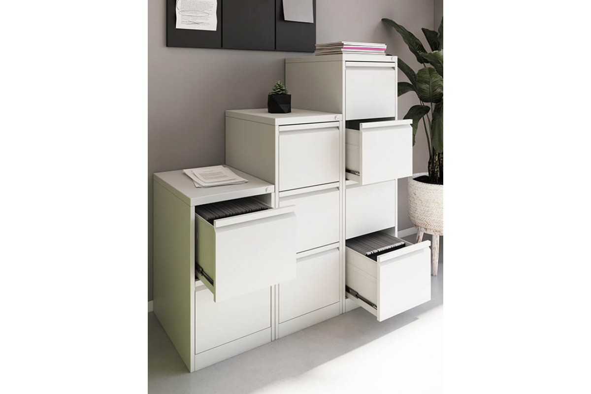 Шкаф оснащён тремя выдвижными ящиками, установленными на шариковых направляющих полного выдвижения, что обеспечивает плавное, бесшумное и полное открывание каждого ящика. Такая конструкция позволяет использовать всё внутреннее пространство и быстро находить нужные документы. Каждый ящик выдерживает нагрузку до 30 кг, подходит для папок формата A4 и Foolscap, а встроенная планка-держатель помогает организовать внутреннее пространство максимально упорядоченно.