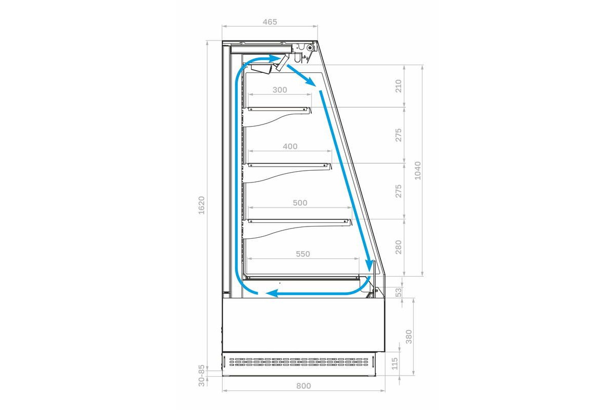 - Необходимо загружать витрину предварительно охлажденными до температуры полезного объема продуктами, равномерно располагая их на полках. Нагрузка на полку не более: 200 кг/кв м;