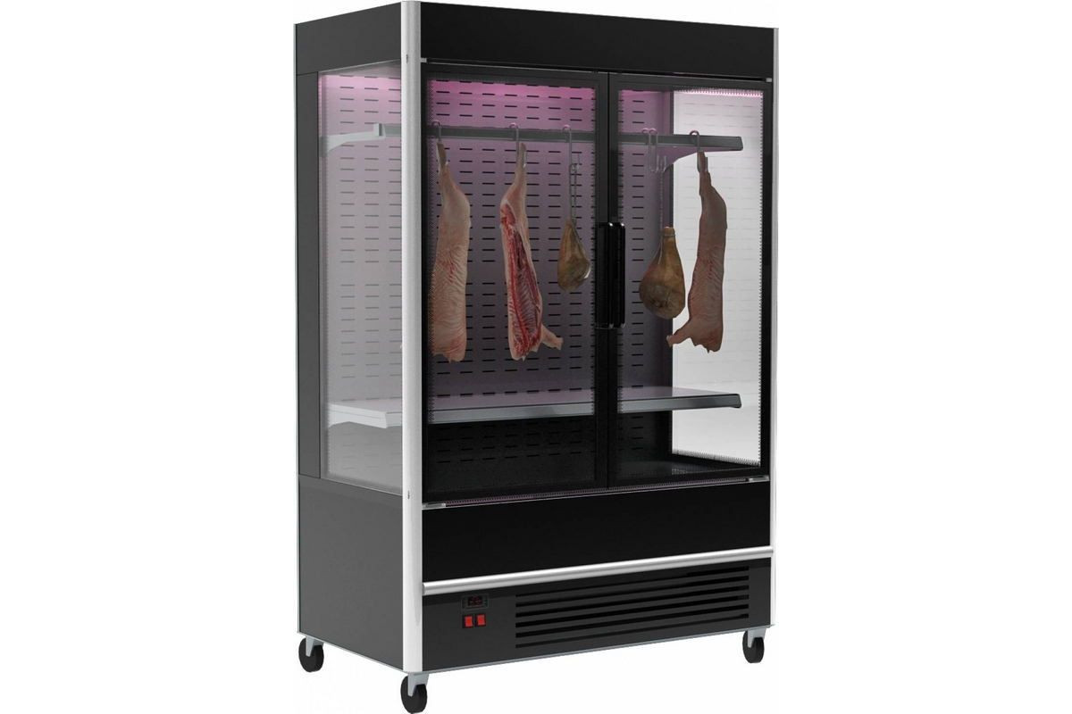 Холодильная горка мясная Carboma FC20-07 VV 1,3-3 X7 (распашные двери структурный стеклопакет, 9005 цвет черный) – специализированное оборудование для демонстрации и реализации свежего и вяленого, копченого мяса большими кусками. Установка пристенного типа – доступ в камеру исключительно с фронтальной стороны.