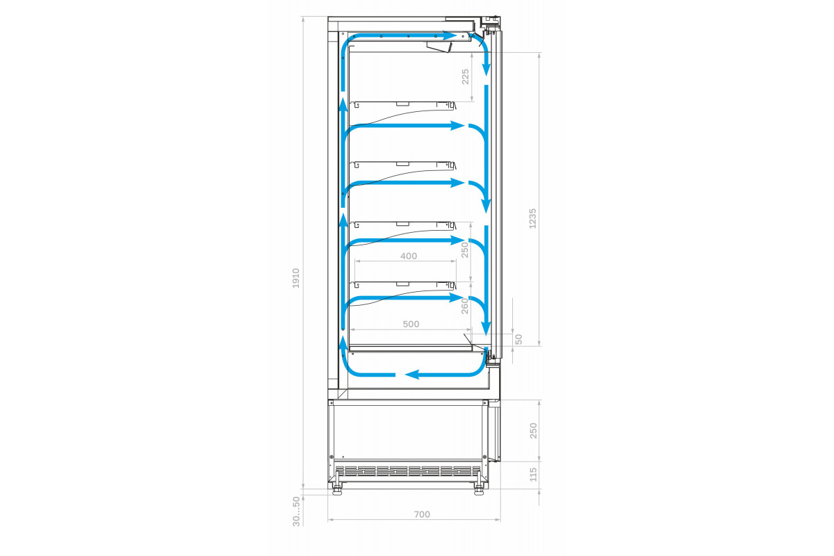 - Глубина выкладки базовой полки 500 мм + 4 рядя полок с глубиной выкладки 400 мм;