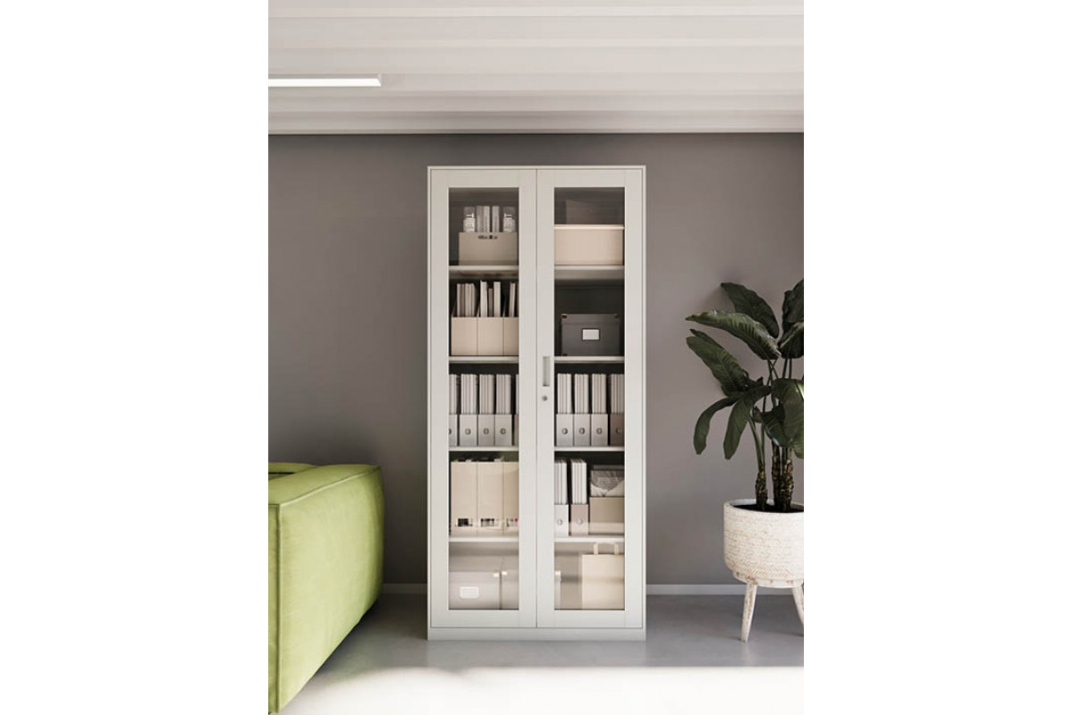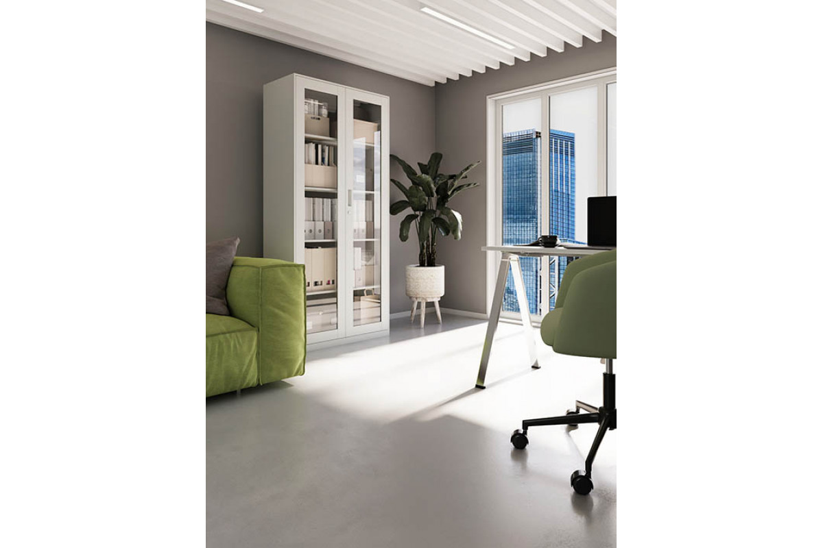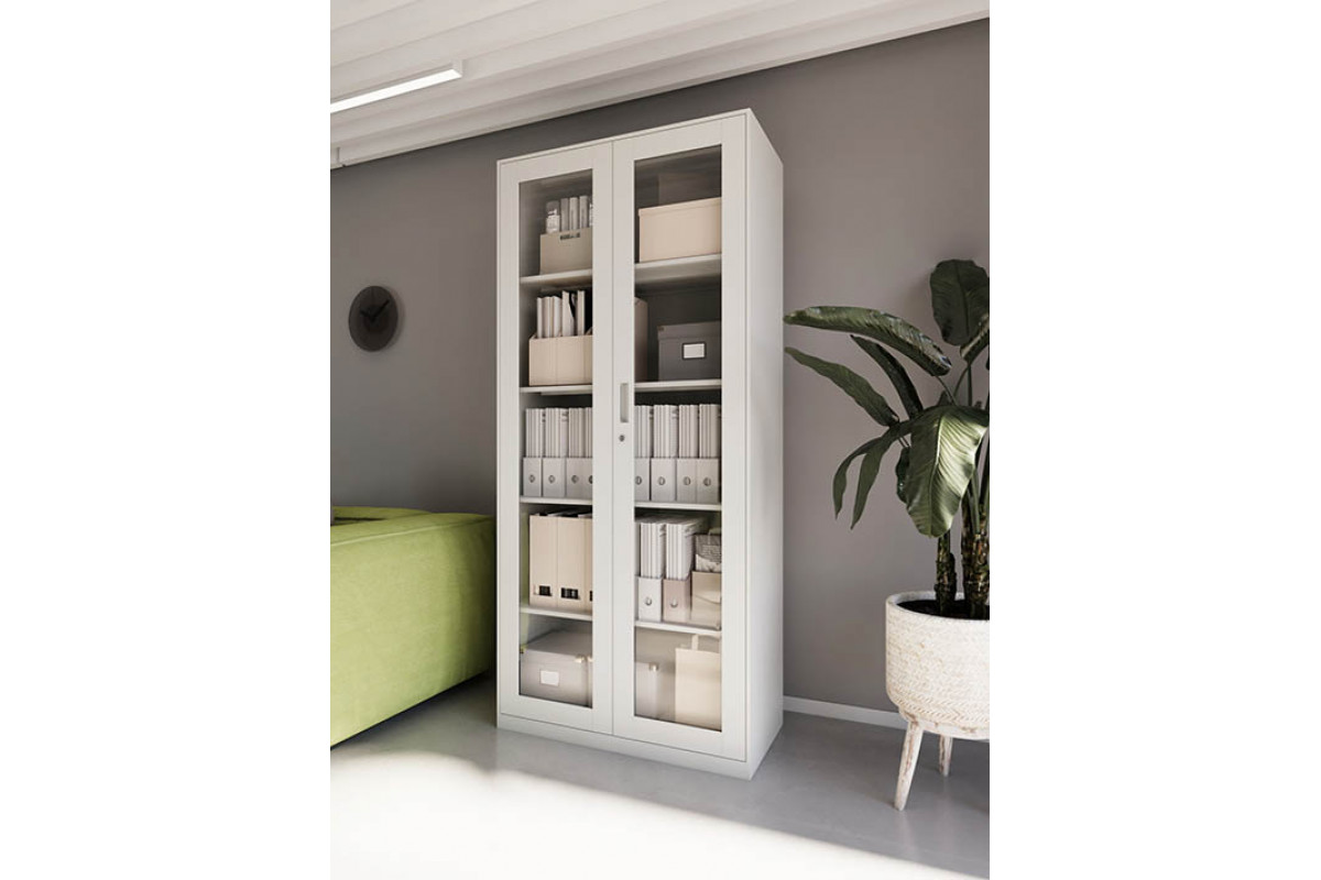 Двери имеют стальную раму со стеклянными вставками иззакалённого прозрачного стекла толщиной 4 мм. Содержимое шкафа хорошовидно, что упрощает поиск нужных документов и визуальный контроль порядка.
