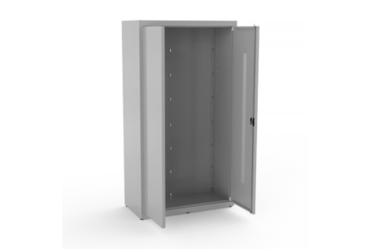 Шкаф состоит из двух боковин, двух стенок задних, двух швеллеров, полки верхней и нижней, двери левой в сборе, двери правой в сборе, замка ригельного.