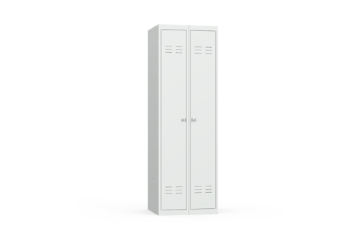 Шкаф имеет две секции, каждая из которых оснащается полкой для головных уборов, металлической перекладиной для вешалок и двумя крючками для одежды, проушиной для навесных замков. Размер секций обеспечивает комфортное размещение верхней одежды, в том числе зимней. Конструкция предусматривает возможность установки дополнительной полки для обуви.