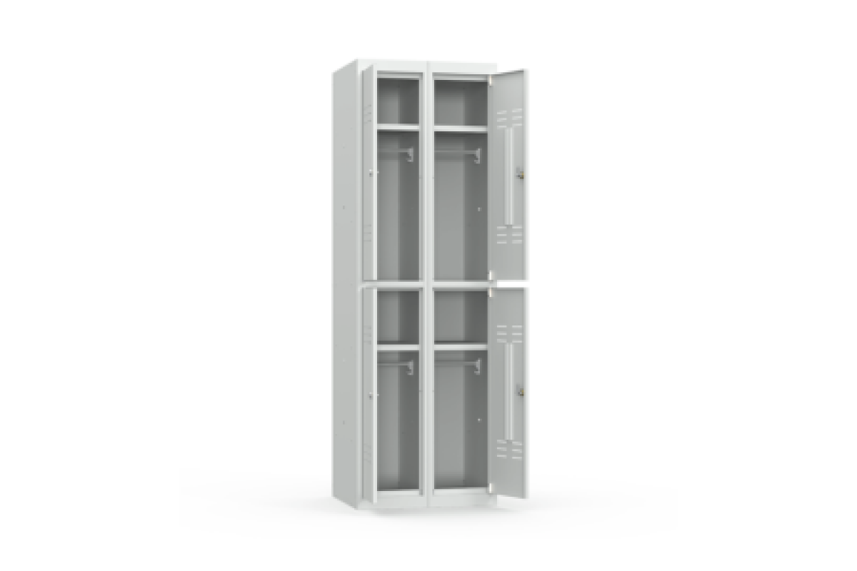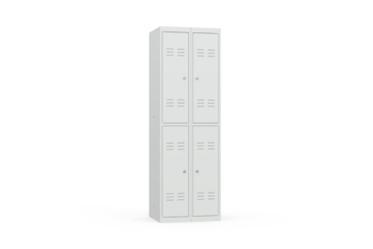 двухсекционный металлический шкаф для одежды отличается наличием четырех ячеек с индивидуальными замками