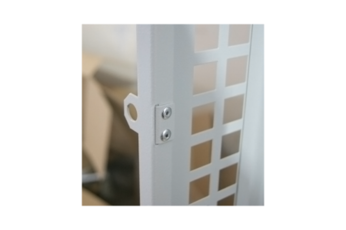 Шкаф имеет 2 перфорированные двери. Перфорация не полная. В середине каждой двери имеется глухой островок размером 1250х80 мм, на котором крепится ребро жесткости.