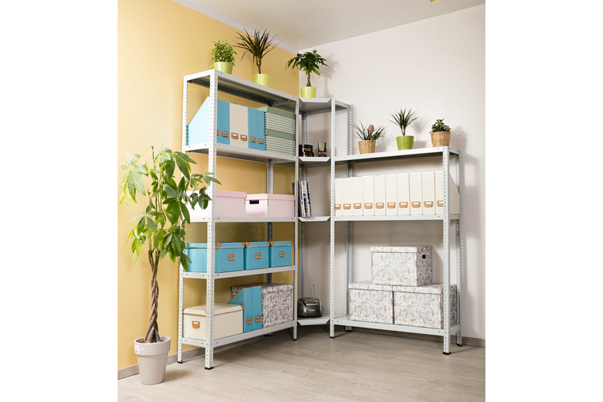 - Для обеспечения жесткости конструкции стеллажа, нижняя горизонтальная пока устанавливается на расстоянии не более 150 мм от пола и крепится по 4 углам к стойкам через металлические уголки жесткости. Верхние уголки жесткости крепятся к 4 углам полки, расположенной на расстоянии не более 2 м от пола.