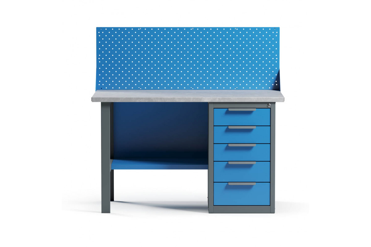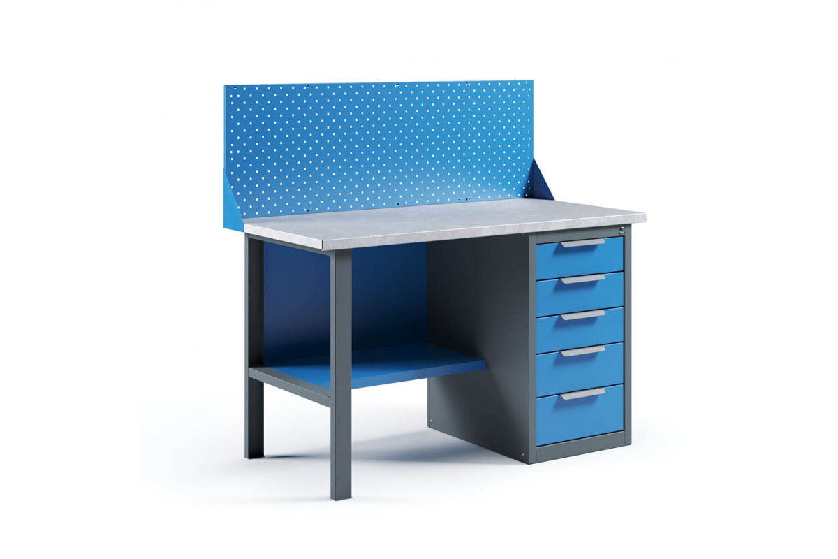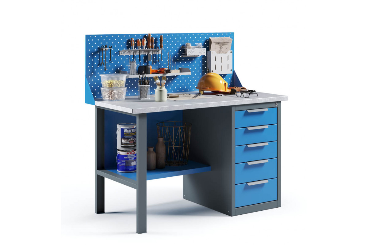 - Верстак укомплектован драйвером с пятью выдвижными ящиками разными по высоте и тумбой с полками.