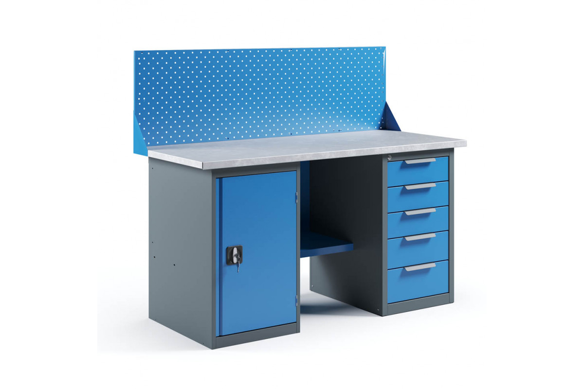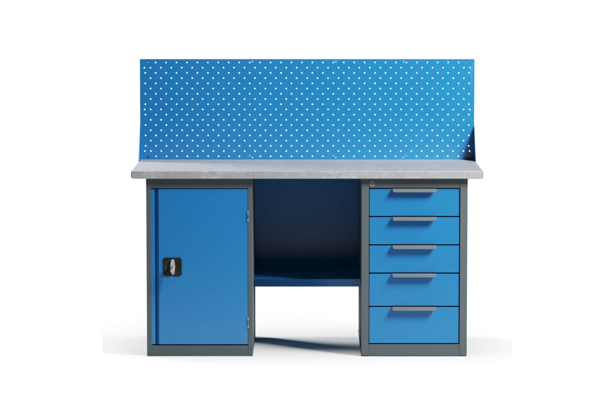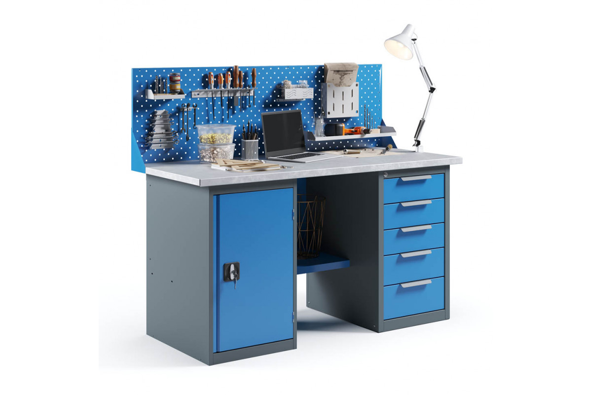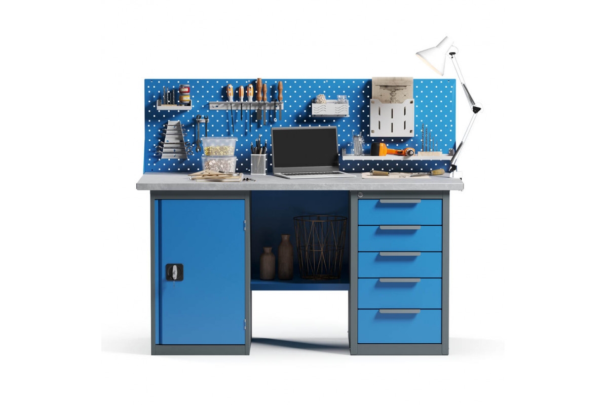 - Верстак укомплектован драйвером с пятью выдвижными ящиками разными по высоте и тумбой с полками.