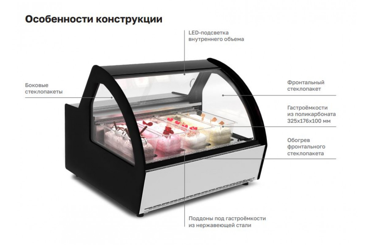 Витрина для мороженого Carboma JOY 2 I83 VL 1,2-1 (0430) используется на предприятиях общественного питания и торговли для охлаждения, хранения и демонстрации мягкого и других видов мороженого. Отлично впишется в любой дизайн помещения. Витрина имеет изогнутый фронтальный и боковые стеклопакеты. Прекрасная видимость ассортимента обеспечивается за счет приподнятых гастроемкостей. Прекрасная видимость мороженого обеспечивается за счет приподнятых лотков и светодиодного освещения внутри витрины.