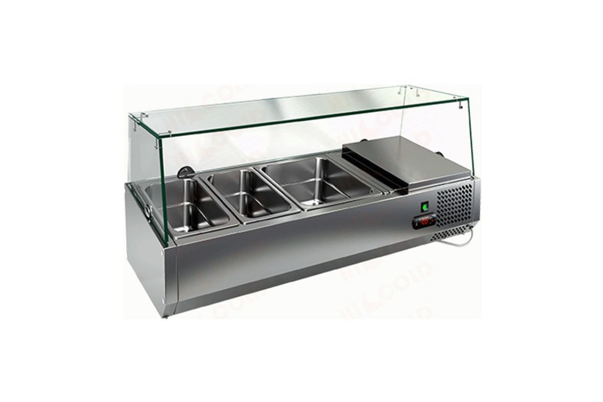 Настольная холодильная витрина HICOLD VRTG 1000 используется на предприятиях общественного питания и торговли для демонстрации, охлаждения и кратковременного хранения салатов, гарниров, закусок и других готовых блюд.