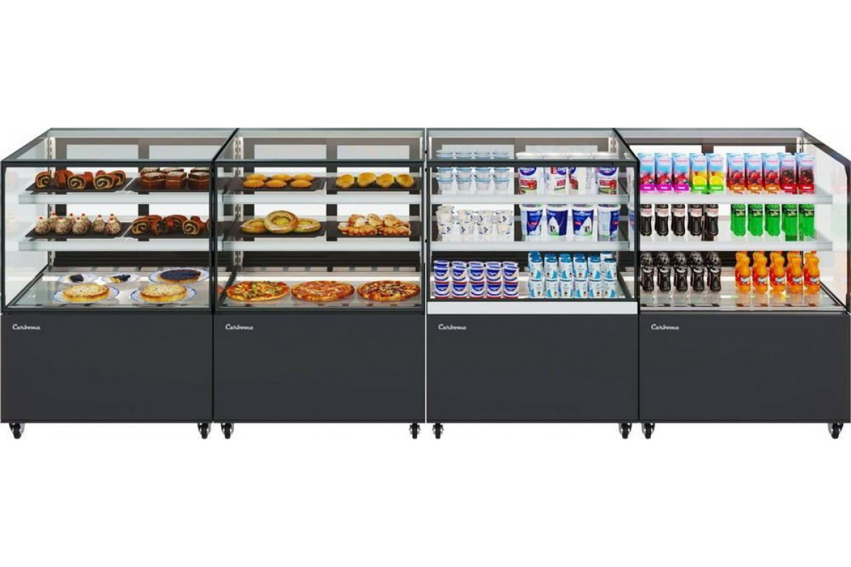 Витрина нейтральная напольная Carboma KC71-130 N 0,9-1 (9005) витрины COSMO идеально подходят для любой конфигурации помещений кондитерской, пекарни, кафе. Дают возможность легко менять и расширять концепцию, варьируя пространством и объёмом экспозиции продуктов. Ровные грани стеклопакетов и отсутствие соединительных планок во внешнем контуре остекления придают витринам легкость и эффект бесконечности.