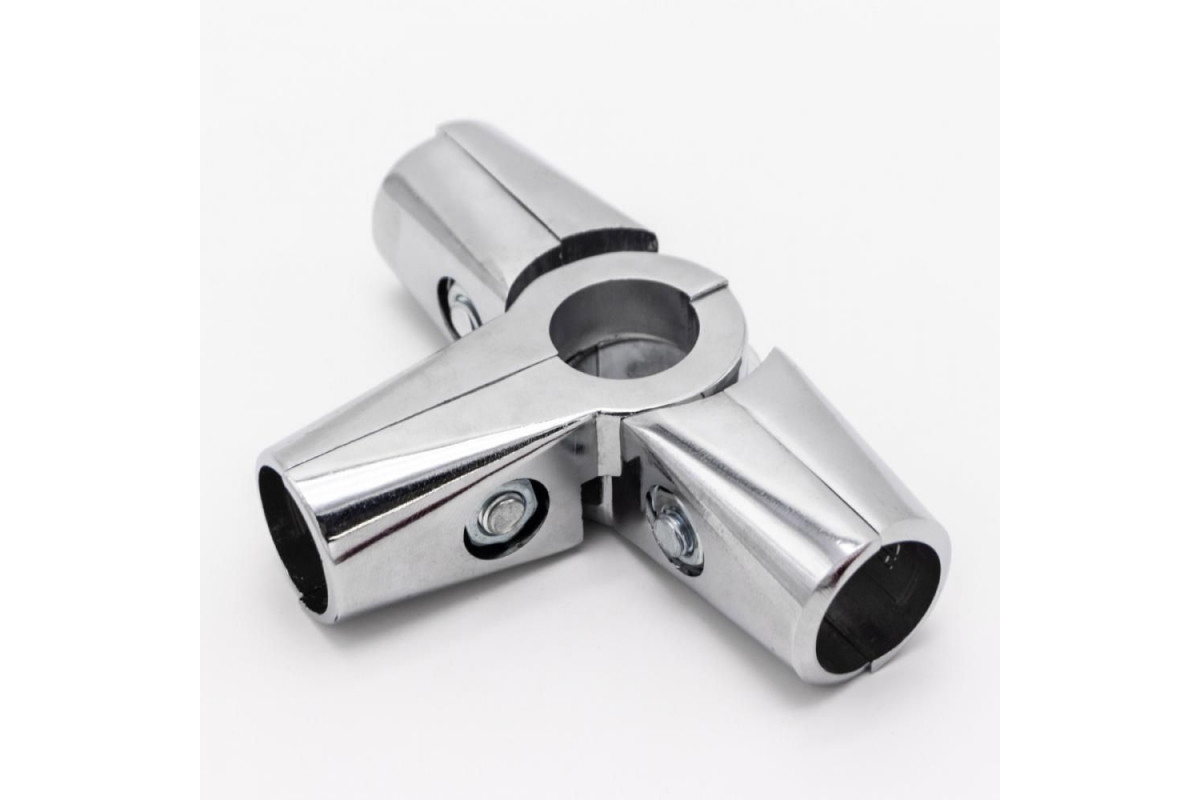 Зажим поворотный усиленный для труб в 4-х направлениях d=25мм, хром. состоит из двух частей, тем самым упрощая процесс сборки конструкций с его использованием. Данный крепёж соединяет 3 трубы: одна из труб по центру проходит насквозь и 2 другие перпенд