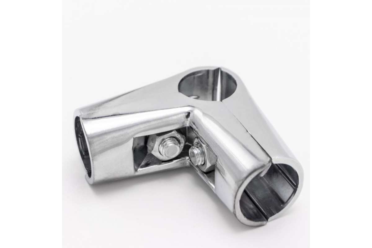 Зажим угловой для труб в 4-х направлениях d=25мм, хром, соединяет 3 трубы: одна из труб по центру проходит насквозь и 2 другие по бокам под углом 90 градусов. Часто используется для создания примерочных, а также разнообразных витрин. Покрытие вакуум
